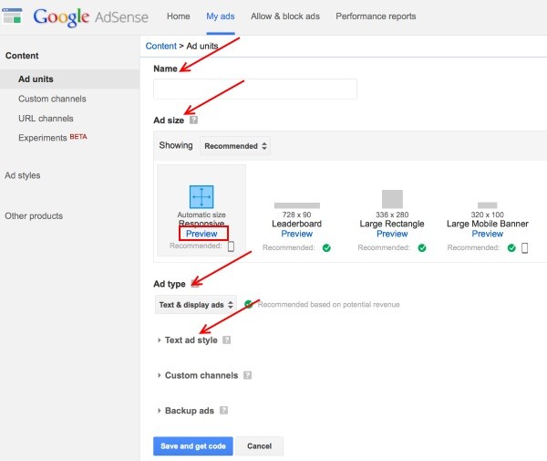 Once your application is approved,log into your AdSense account and go to My Ads > New ad unit. Fill the name, size, type, and style. Click on preview to see how each ad size looks in an actual page. After filling the fields, click “Save and get code” at the bottom of the page.Copy your ad code and save it in a text editor such as Notepad.